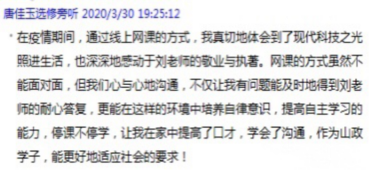 为了提高员工的表达能力,提升他们的综合素养,体现以员工的发展为根本的教学理念,同时也为了帮助员工们能够在今后的各类招考招聘中脱颖而出,在未来的工作岗位上出类拔萃,2026世界杯官方合作网站开设了《应用口才》这门课。也正因为它的重要性,才使这门选修课程拥有众多“粉丝”,深受员工们的喜爱。值得一提的是,由于人数限制有一些同学没有选到刘老师的课程,这次由于网络授课不受人数的限制,除了员工名单上已确定的员工外,还有不少员工慕名而来,开启旁听模式,其中包括本部的焦贵来和唐佳玉两位同学自开课到现在一直跟班听课一节课没落下。一方面,这反映出员工们对这门课的认可和喜爱,另一方面,也彰显了网络授课的优势,让教学资源可以超越时空限制,实现资源共享。