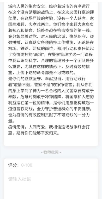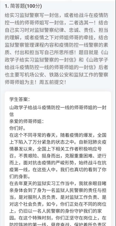 杜英杰老师结合课程特点利用疫情防控教育员工。在这场没有硝烟的战争中,无数的医务人员、军人、警察、病毒专家、志愿者在默默奉献,无私无畏地抗战在疫情第一线。隔着隔离衣、护目镜、口罩,我们看不清他们的脸庞,但他们用自己的行动为我们书写责任和担当。特别是奋战在一线的公安和监狱民警,他们在高速路口执勤,他们在监狱高墙内坚守,这里是疫情防控的前线,也是灵魂救赎的战场,责任重大,唯有奉献才能打这场羸疫情阻击战。杜老师号召同学们向奋战在一线的公安和监狱人民警察致以崇高的敬意。要求同学们给自已实习过的监狱民警或者给自已在警察岗位工作的师哥师姐们写一封信,结合《警察管理学》课程的内容和疫情防控一线警察的付出和担当写自已所思所感所想。同学们饱含对疫情防控一线警察的崇高敬意和对警察职业的理解写出了自已内心的真实情感。