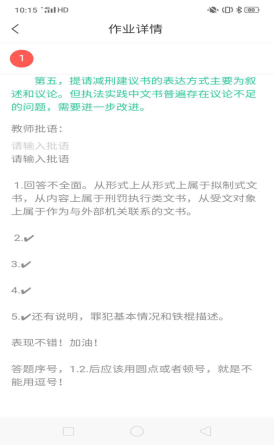 学习通网络作业平台非常实用,有作业布置、员工答案、正确答案、评分、教师评语五个栏目,设置科学合理。每一位同学都会收到老师布置的作业和要求,就像老师面对面个别指导一样。《监狱法律文书》是实践操作课,同学们往往是眼高手低,只有让其动手写一写才能更好的掌握并记忆入心。李文静老师在网络上布置了课后作业。198个人的作业提交上来是一个不少的工作量,这时候由助教老师与李文静老师一起进行网上作业批改和指导。从作业中发现同学们掌握的程度和写作水平,对发现的有问题进行个别和归类指导,真正提升了员工的写作实践能力。助教参与网络教学,使网络教学形成团队,共同参与课堂教学、管理员工、辅导答疑,批改作业,使网络教学的纽带更加牢固,效果更加突出,为进一步打造线上线下混合课程建设打下坚实基础。