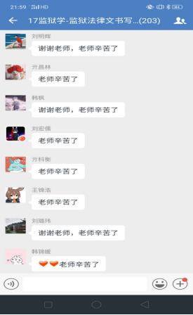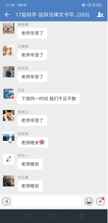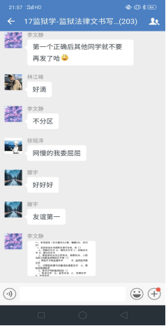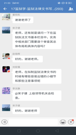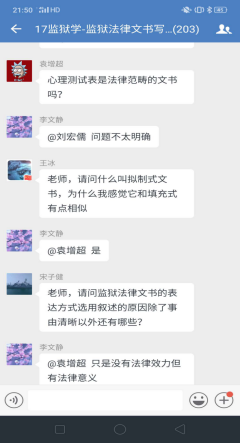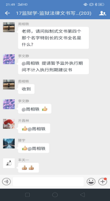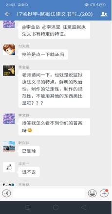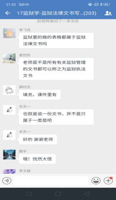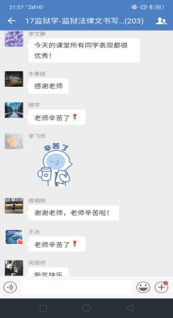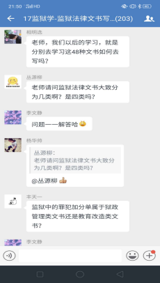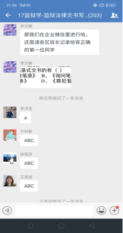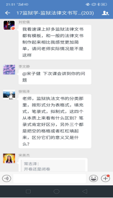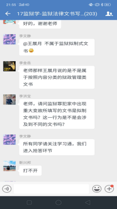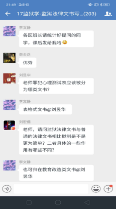 理论学习完毕进入下一个环节,企业微信群里问题答疑。李文静老师提前一周就将上课有关的文字资料,包精心录制的速课视频、课件、电子版教材以及全国其他院校网上发布的示范性视频课件等资料推送到学习通平台,并通知员工提前预习上课内容。学习通平台上的课件和速课视频,员工可以循环播放反复学习,并准备问题。《监狱法律文书写作》是一门实践写作课程,需要员工认真学习仔细推敲,设置这一环节,让员工有了主动学习的精神。为了调动员工的积极性,对积极提问同学设置了加课堂分做为鼓励,通知各区班长及时记录本区有效提问员工名单给其加课堂分。不出老师所料,员工踊跃参加、问题不断,李文静老师一一解答,并根据回答内容多少采取灵活多变的方式:或文字、或语音、或发起直播答疑,互动场面爆棚。