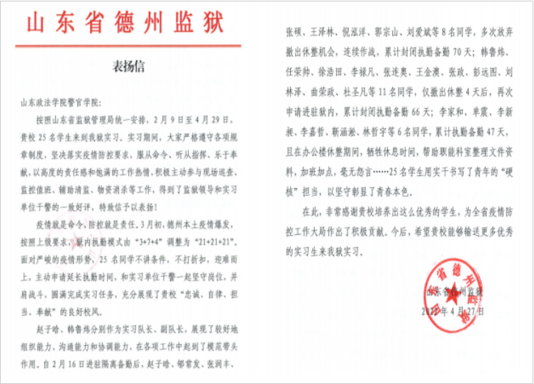 赵子晗、韩鲁炜等25名同学在德州监狱实习期间,正值监狱疫情防控形势严峻复杂,封闭执勤时间延长,工作量加大。同学们坚决落实疫情防控要求,服从监狱安排,积极主动参与到各项工作中,封闭执勤期间多次放弃撤出休整机会,连续作战,并圆满完成了实习任务。同学们的知行合一和担当奉献得到了监狱领导和实习单位干警的一致好评。