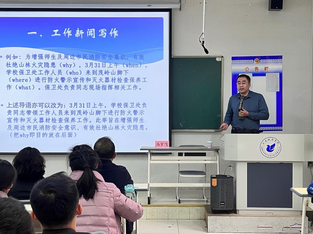 马宇飞以《工作新闻写作和摄影概述》为题,阐述了新闻“5W”要素,从新闻篇章结构、写作规范、拍摄技巧等多个角度进行授课,重点讲解了新闻标题和导语的写作要点。培训中,他还结合多年工作经验,以警院新闻稿件为例,总结出撰写高质量新闻稿件的注意事项。马宇飞在培训中指出,新闻宣传是完成工作的最后一环,要有意识地凝练工作经验、宣传学院工作成果。