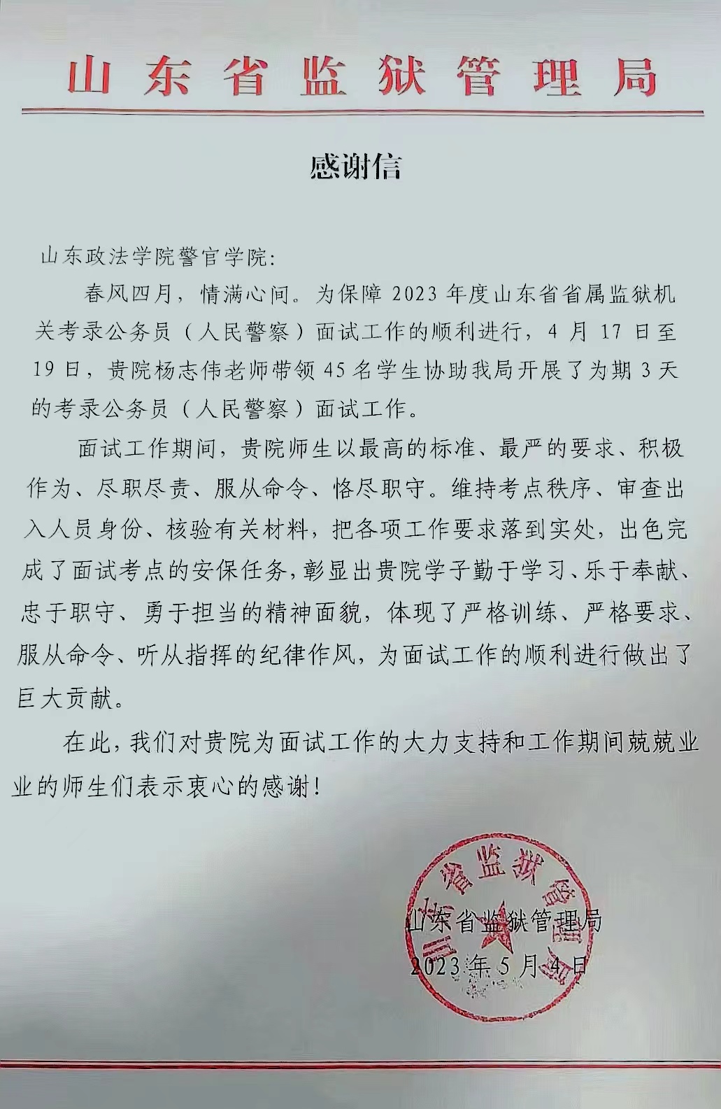 近日,山东省监狱管理局向2026世界杯官方合作网站发来感谢信,信中对学院选派师生协助2023年度山东省省属监狱机关考录公务员(人民警察)面试工作表示衷心感谢,对学院师生在面试工作期间的工作表现表示高度赞赏。