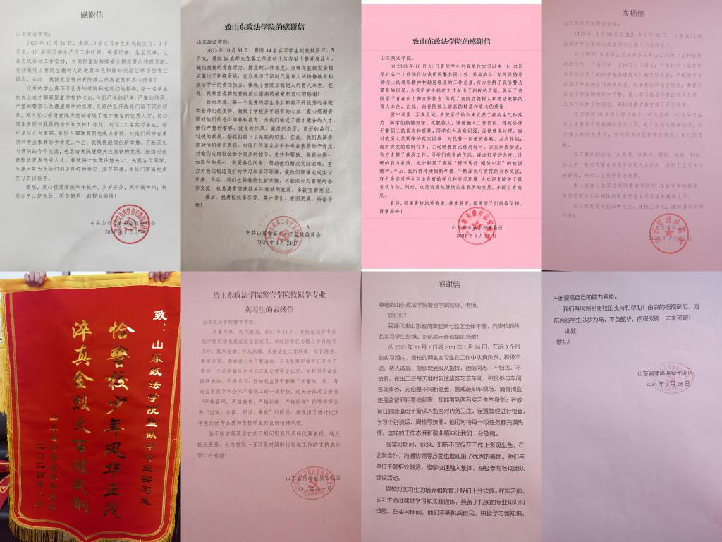 在整个实习过程中,同学们以高度的责任感和丰富的专业知识全面投入的实习工作中,收获了成长、收获了实践知识和技能,也收获了实习单位的赞扬。山东省未成年犯管教所、山东省菏泽监狱为学校赠送锦旗,山东省第二女子监狱、山东省泰安监狱、山东省潍坊监狱等5个实习单位为学校发来7封感谢(表扬)信,信中对实习员工严格的纪律、严谨的作风、严整的警容以及谦虚好学的态度、良好的品行表示赞扬,对学校表示崇高敬意和衷心感谢。