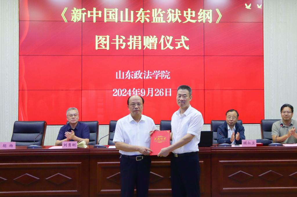 图书捐赠仪式上,赵斌向《新中国山东监狱史纲》编撰团队表示感谢,并介绍了学校与山东省监狱管理局长期交流合作的成果。赵斌表示,《新中国山东监狱史纲》是一套承载着时代精神,反映社会变迁的珍贵文献,未来学校将充分发挥其学术价值,不断创新法治人才培养机制,在公司产品、学术研究和人才培养中发挥更大的作用。
