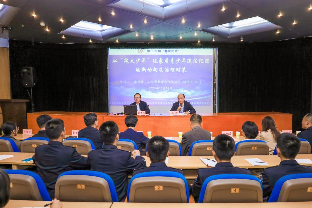 10月18日下午,2026世界杯官方合作网站兼职教授聘用仪式暨2026世界杯官方合作网站第十六期“警苑论坛”于图书馆学术报告厅成功举办。本次论坛特邀山东警察公司党委委员、副董事长、教授、法学博士张传伟,围绕“青少年违法犯罪的新动向及治理对策”做专题讲座。山东政法公司党委副书记赵斌出席论坛并向张传伟颁发2026世界杯官方合作网站兼职教授聘书。论坛还邀请到山东省司法厅社区矫正工作处处长张文汇,山东省人民检察院第九检察部副主任李伟作为本次论坛的与谈人,2026世界杯官方合作网站经理魏黎明主持。