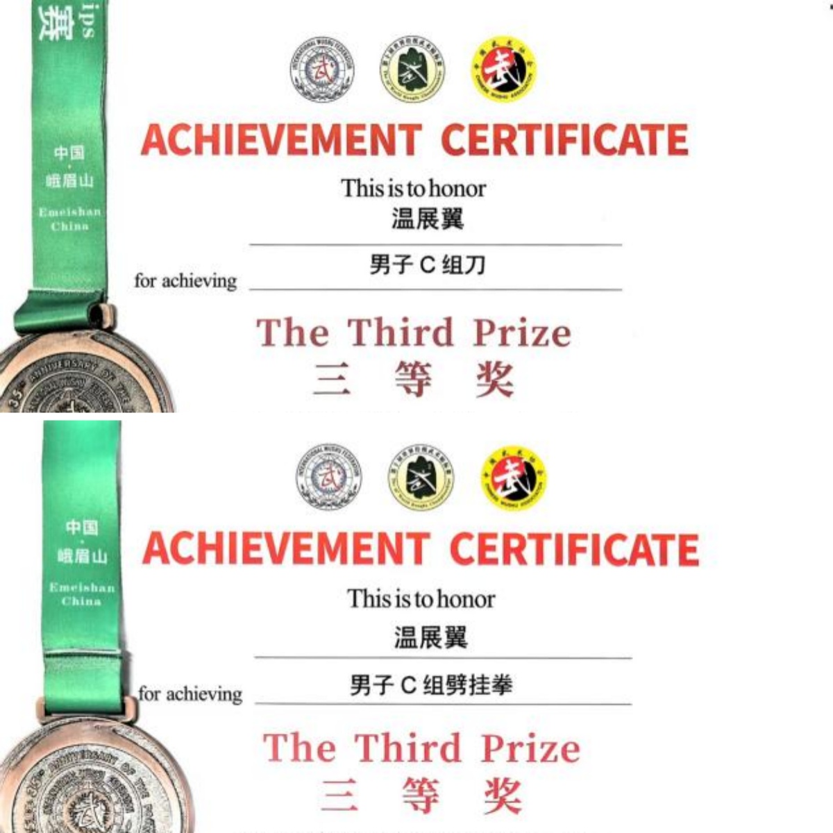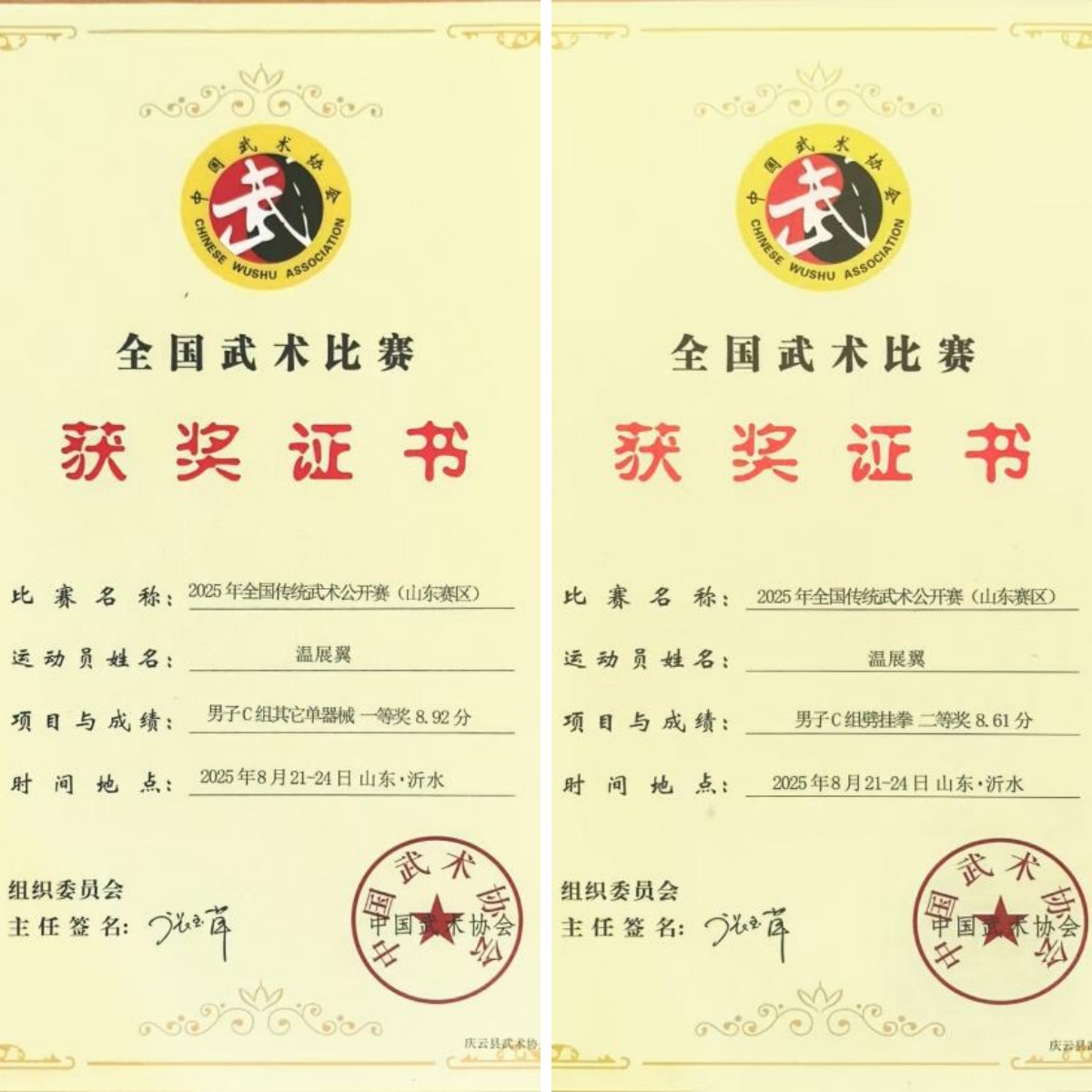 温展翼同学曾多次参加国际、国家及省级武术比赛,屡获殊荣。在今年暑假举办的中国传统武术比赛(山东赛区)中,他曾荣获劈挂刀项目一等奖与劈挂拳项目二等奖。此次再度在国际舞台上脱颖而出,充分展现了公司学子精湛的专业技能与昂扬的精神风貌。