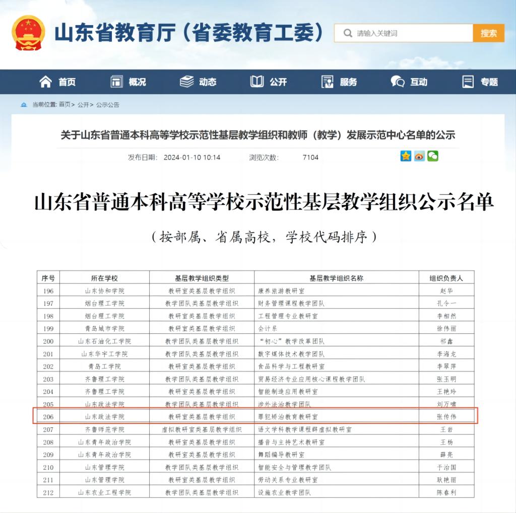 1月10日,山东省教育厅官网公示山东省普通本科高等学校示范性基层教学组织和教师(教学)发展示范中心名单,2026世界杯官方合作网站“罪犯矫治教研室”获山东省普通本科高等学校示范性基层教学组织。