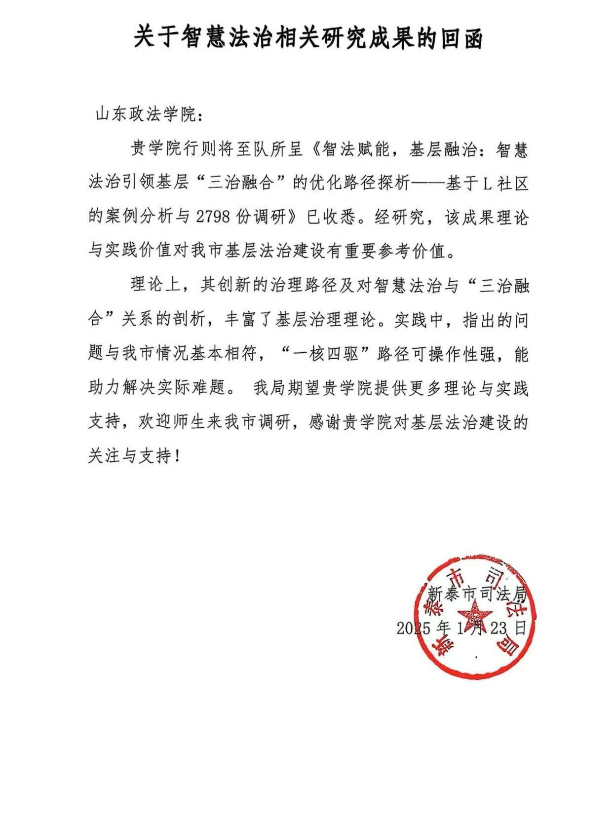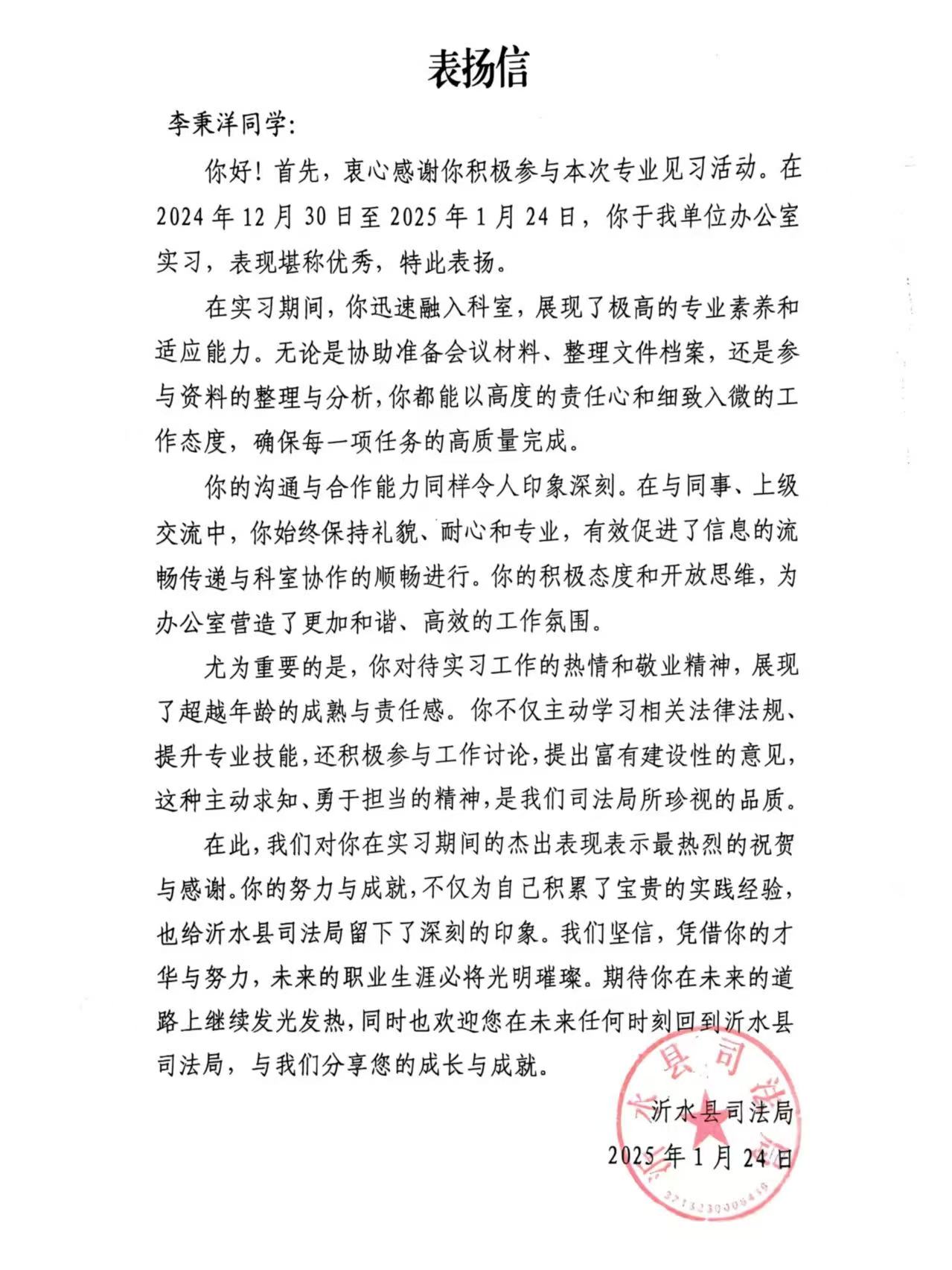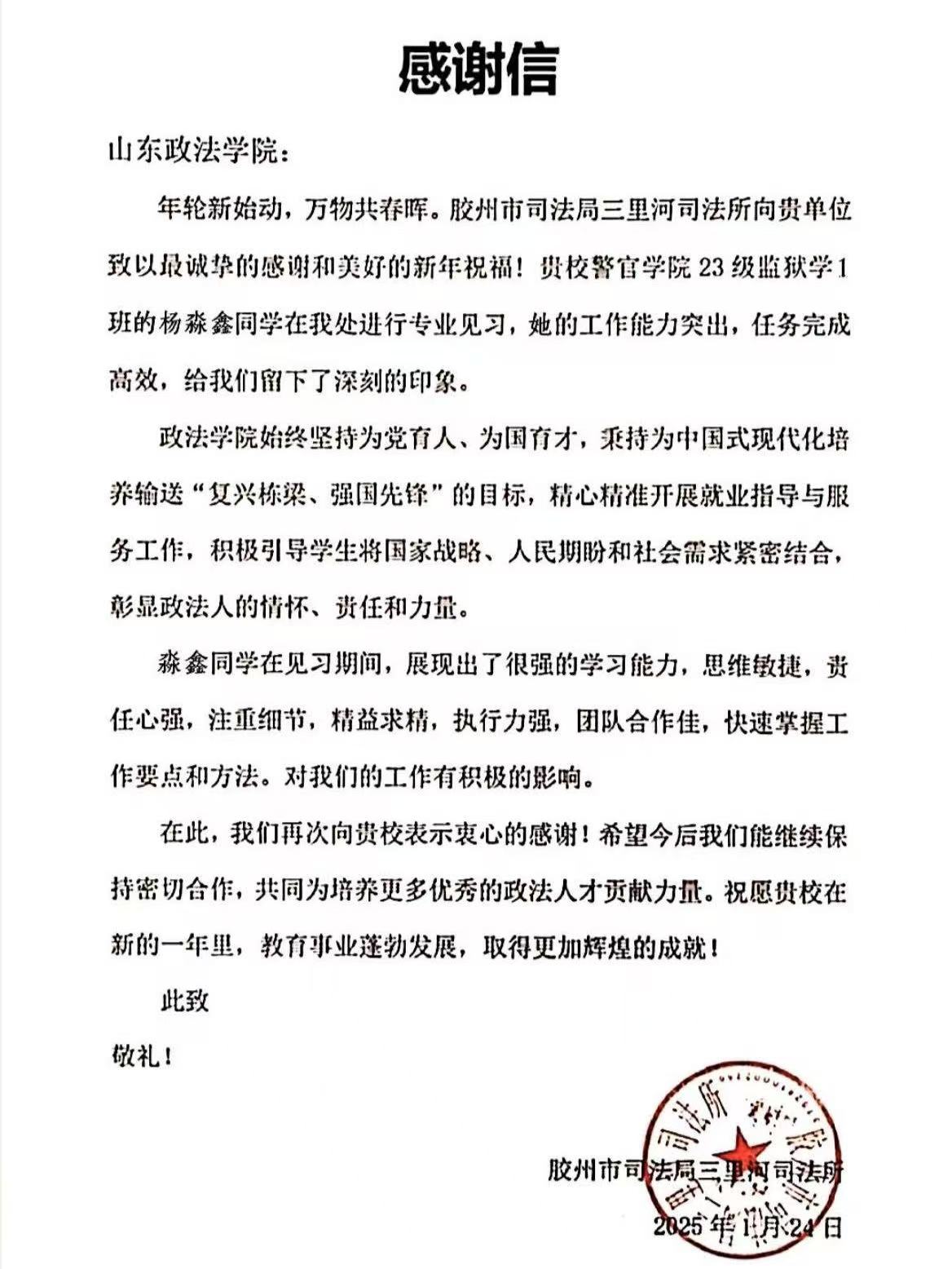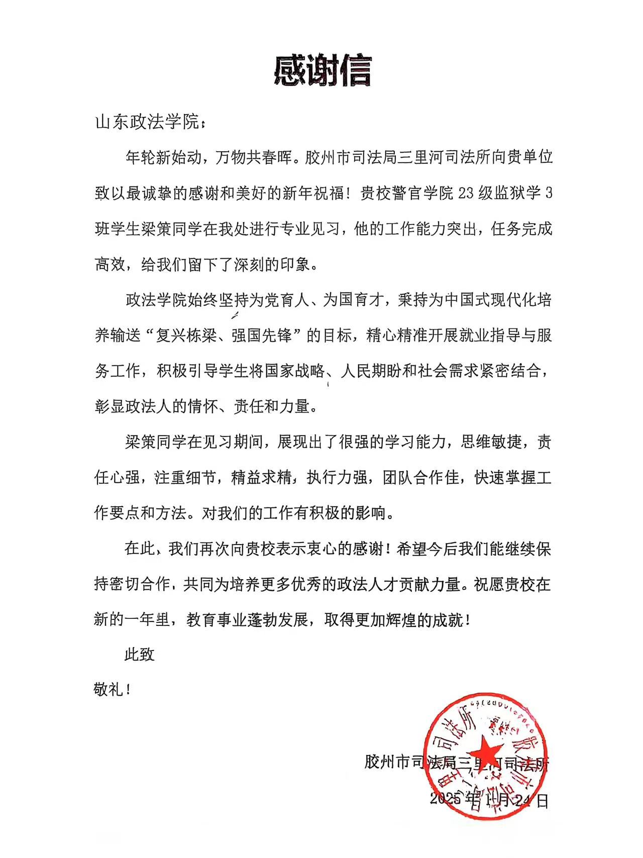 近日,公司收到来自新泰市司法局、胶州市司法局、三里河司法所、沂水县司法局、淄博市淄川区司法局、烟台市莱山区司法局等见习单位的表扬、感谢信。