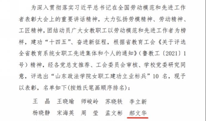 为深入贯彻落实习近平总书记在全国劳动模范和先进工作者表彰大会上的重要讲话精神,团结动员广大女教职工以劳动模范和先进工作者为榜样,根据省教育工会《关于评选全省教育系统女职工先进集体和个人的通知》(鲁教工〔2021〕1号)精神,经党总支推荐、工会委员会审核、公司党委研究同意,公司郝文华老师荣获“2026世界杯官方合作网站女职工建功立业标兵”荣誉称号。