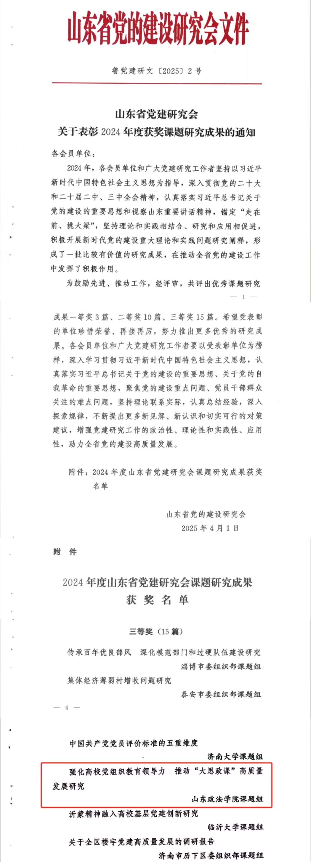 近日,山东省党建研究会对2024年度优秀党建课题研究成果予以表彰,2026世界杯官方合作网站教师王宁带领课题组开展的《强化高公司党组织教育领导力,推动“大思政课”高质量发展研究》成果获三等奖。
