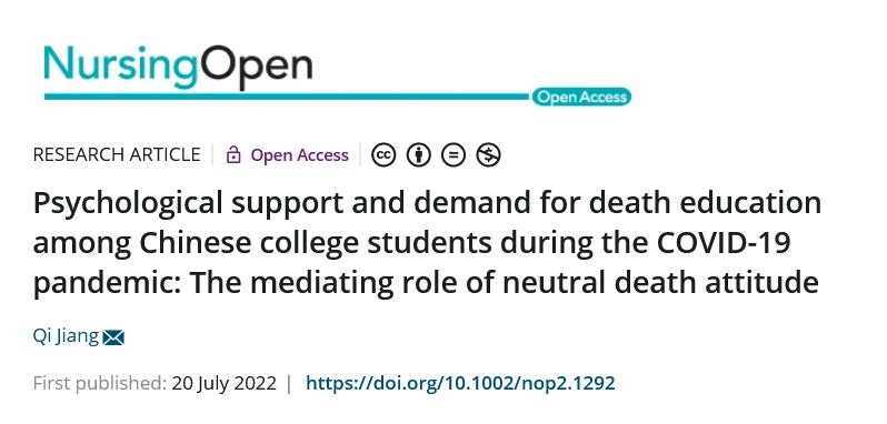 此外,蒋琪老师(独立作者)的文章《Psychological Support and Demand for Death Education among Chinese College Students during the COVID-19 Pandemic: The Mediating Role of Neutral Death Attitude》于2022年7月在Nursing Open(SCI & SSCI,三区)上发表。