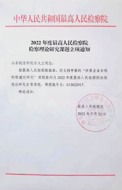 2022年7月21日,最高人民检察院发布2022年度检察理论研究课题立项公告。公司孙文立老师主持申报的课题“涉案企业检察建议研究”获立项支持,课题编号为GJ2022D17。