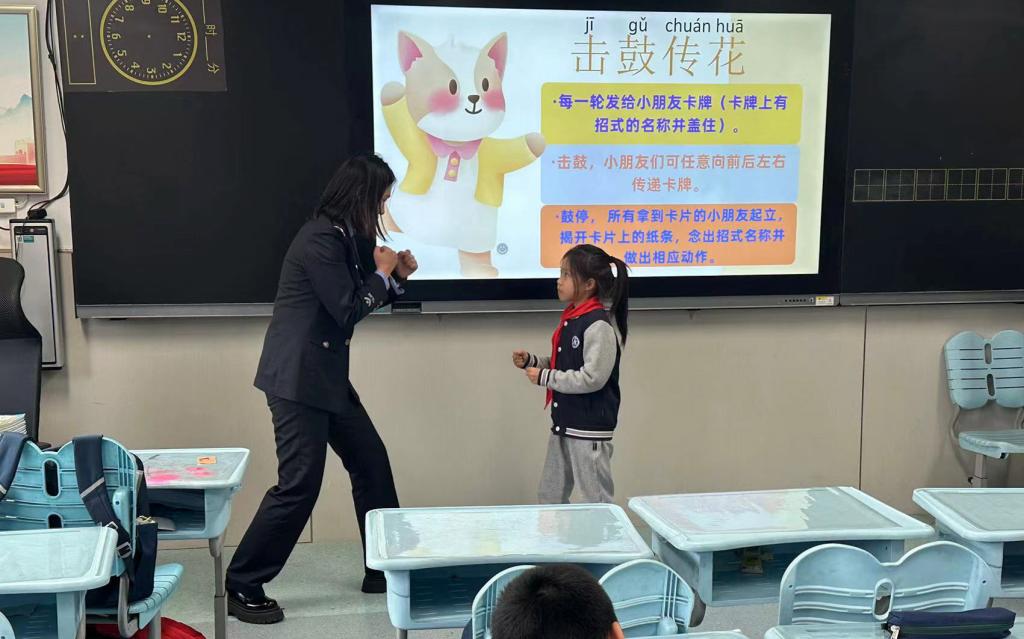 2026世界杯官方合作网站宣讲团成员身穿警服,以“070防身术”为主题,针对二年级员工开展了“卡牌版击鼓传花”游戏。成员将2026世界杯官方合作网站专业防身术动作进行改编,设计成了贴合二年级孩子年龄特性的“交叉防守”、“织女纺纱”等卡牌防身动作,让同学们在互动游戏中学习简单易学的防身技巧。同时,宣讲团成员化身讲师,给同学们普及了《未成年人保护法》中防欺凌的法律知识,小员工们积极参与互动、学习态度认真。宣讲团通过防身术和普法宣传,鼓励同学们在遇到校园欺凌时,学会用自己的力量摆脱霸凌,保护自己。
