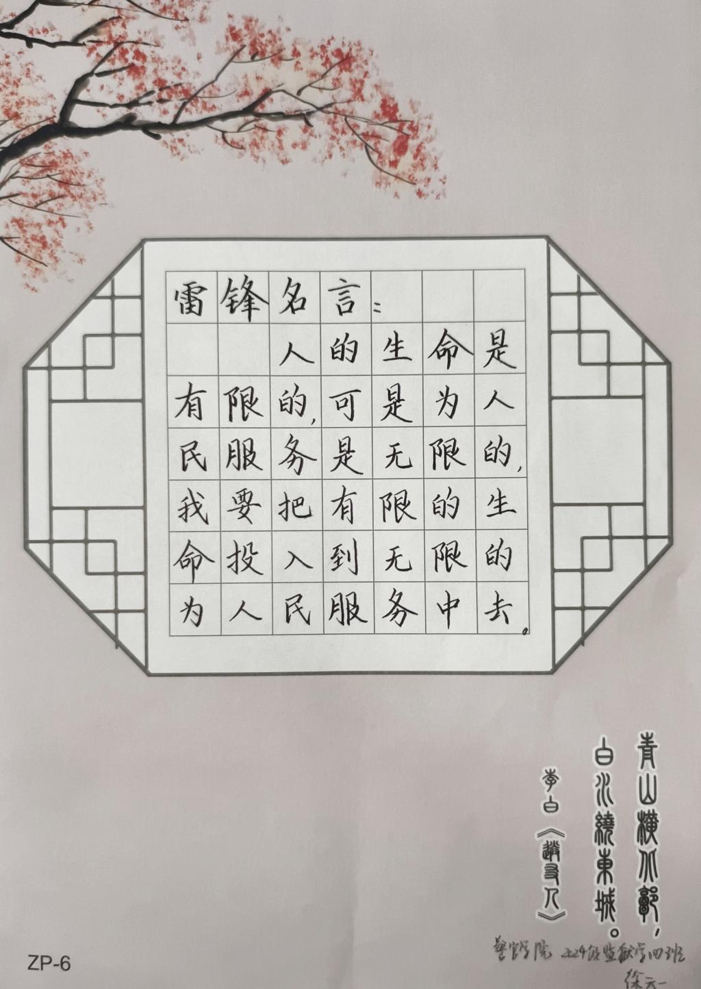 在一幅幅书画作品中,不仅体现了同学们扎实的书法功底,更将各班围绕学雷锋精神,做追“锋”青年主题,精心设计板报、装饰教室,或绘图再现雷锋劳动奉献的场景,或摘抄雷锋日记、名言警句,重温雷锋精神。同学们分工明确,有的负责绘画设计,有的专注于文字撰写,精益求精。同学们将雷锋精神融入到日常学习生活中,美化教室环境的同时,传递正能量,弘扬主旋律,践行忠诚、自律、担当、奉献的警院氛围。